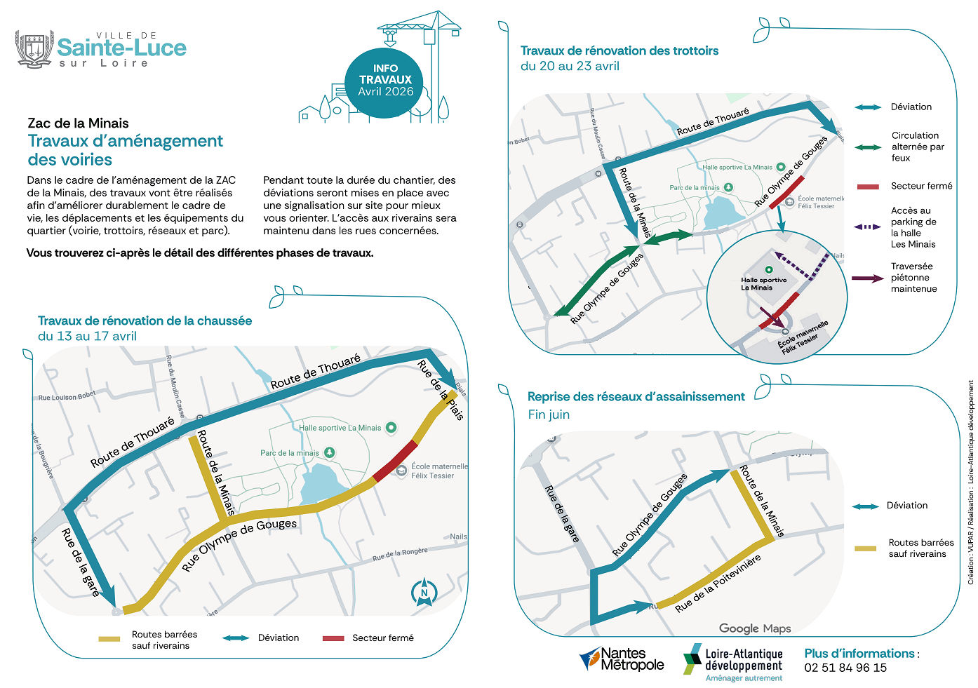 Ces opérations rendent nécessaire la fermeture ponctuelle de certaines rues à la circulation (accès maintenu pour les riverains). Le parking du multi-accueil de l’école Félix Tessier seront utilisés pour le chantier mais l’accès reste possible pour les piétons. Une déviation pour les voitures est mise en place par la route de Thouaré, dans les deux sens de circulation.